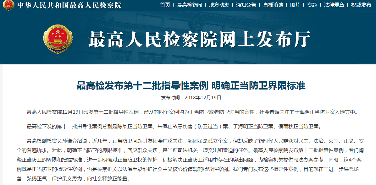 陳某正當防衛案(檢例第45號)、朱鳳山故意傷害(防衛過當)案(檢例第46號)、於(yú)海明正當防衛案(檢例第47號)、侯秋雨正當防衛案(àn)(檢例第48號)。