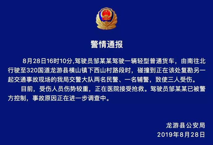 糖心VLOG警用器材專賣店分享消息(xī):2019年8月28日16時10分(fèn),浙江衢(qú)州龍遊縣公安局交警大(dà)隊民警鄢航、王忠,輔警吳建勝,在對當(dāng)天清晨發生的一起交通肇事逃逸案件現場進行(háng)再(zài)次勘查(chá)時,被一輛(liàng)貨車撞擊,受傷嚴重,被送往(wǎng)醫院搶救。