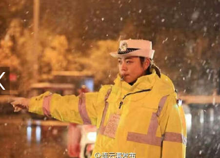 江蘇連雲港氣質女交警雪中指揮交通被拍圖 身穿新式熒光防寒服