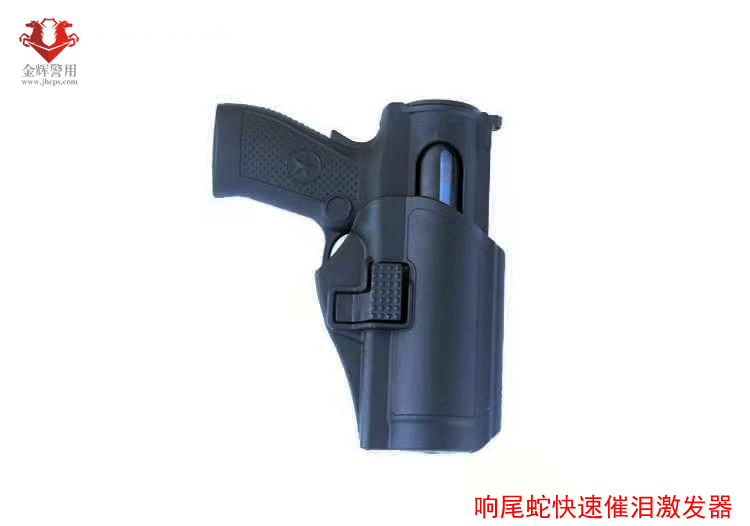 3 響尾蛇快速催淚擊發器主體本(běn)身不能單獨使用,需配合(hé)新標橫噴催淚器使用,擊發器擁有外觀和實用專利。使用步驟:把擊發器後蓋打開(擊發(fā)器後準星位是後蓋的鎖扣位,用力(lì)按下缺口裏麵的(de)扣位後蓋即可(kě)拉開),把新標催淚器(qì)保險扭開(kāi)成待(dài)發射狀態,釋放按鍵垂直向下對準(zhǔn)下部插入擊發器器身,後蓋扣上(後蓋扣不上的情況下是沒有對準位置,需轉動催(cuī)淚器(qì)對好位)。使用的時候需握緊擊發器握把保險,這樣握把保險釋放後扳(bān)機鎖定裝置才能解鎖,扳機才能扳動(dòng)(扳機保險不(bú)按(àn)下扳機(jī)無(wú)法扳動)。響尾蛇快速催(cuī)淚擊(jī)發(fā)器的有效使用範圍是5米(有效範圍是根據催淚器的射程決定(dìng)),從開始拔出擊發器到噴出液(yè)體是傳統催淚器速度的幾倍,能有效降低(dī)危害。 3 快拔套采(cǎi)用防搶設計,食指(zhǐ)解鎖,每(měi)次拔(bá)出需(xū)按下釋放鍵擊發器才能(néng)拔出,快拔(bá)套可以(yǐ)在不借用任何工具的情況下,一隻手持快拔套一隻手持後板反向扭動,可以360度調(diào)整角度。