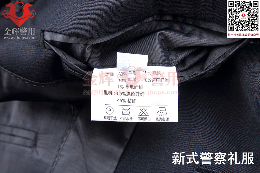 警察禮服上衣和褲子裏料: 55%滌(dí)綸纖維,45%粘纖。