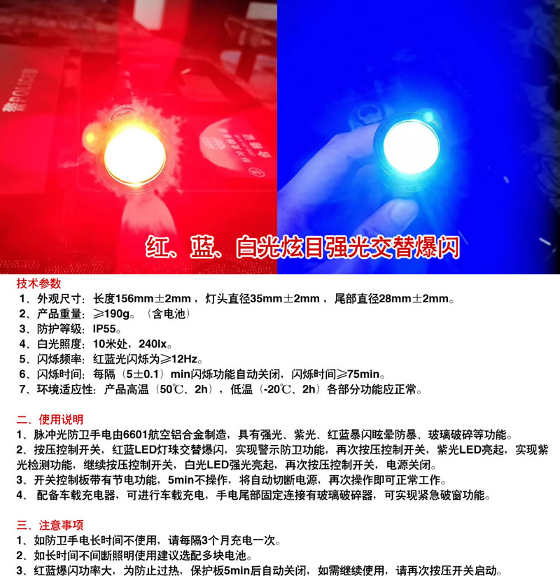 1、脈衝光防衛手(shǒu)電由6601航空鋁合金製造,具(jù)有強光、紫光、紅藍暴閃(shǎn)眩(xuàn)暈防暴、玻(bō)璃(lí)破碎等功能。