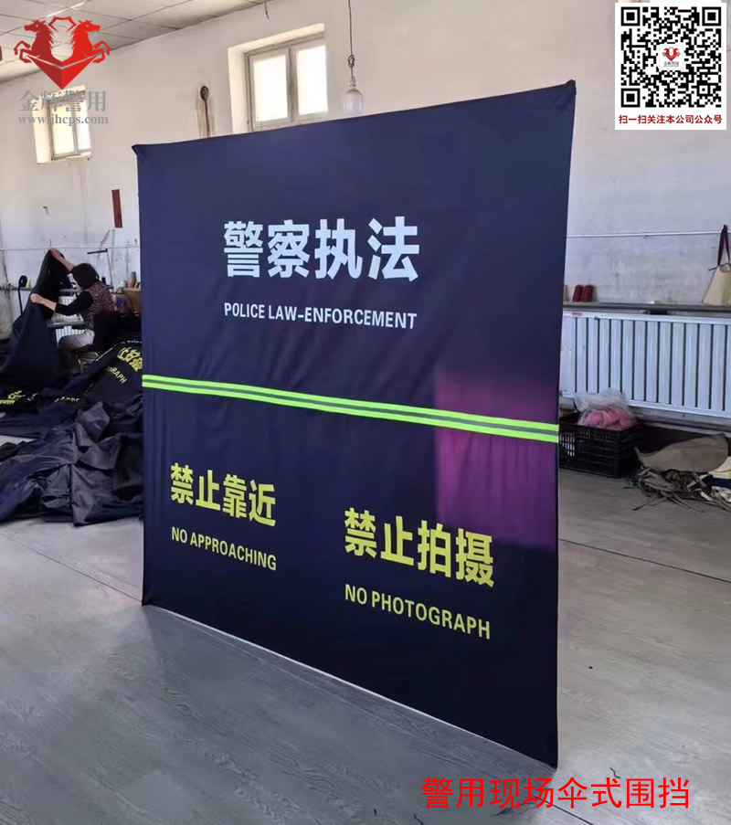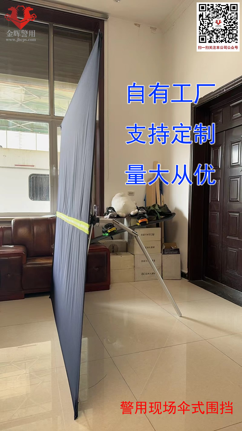 警用鋁合金傘式圍擋、收放簡便,展開高1.95米(mǐ),總高2.35米,就是(shì)4平方每個。可(kě)根據單位需求定製文字。 主杆 38圓 管壁1.2 傘股16圓 管壁1.0 傘式圍擋的杆子(zǐ)采取分體式可拆部件(jiàn)。 塑料件:ABS 傘布:280克滌綸布(bù) Pu塗層 防潑水塗層 色牢度:歐標4級 包裝尺寸:1米*20厘米*20厘米,立起來的邊高1.95米,總高2.35米,重量4.5公(gōng)斤一個。