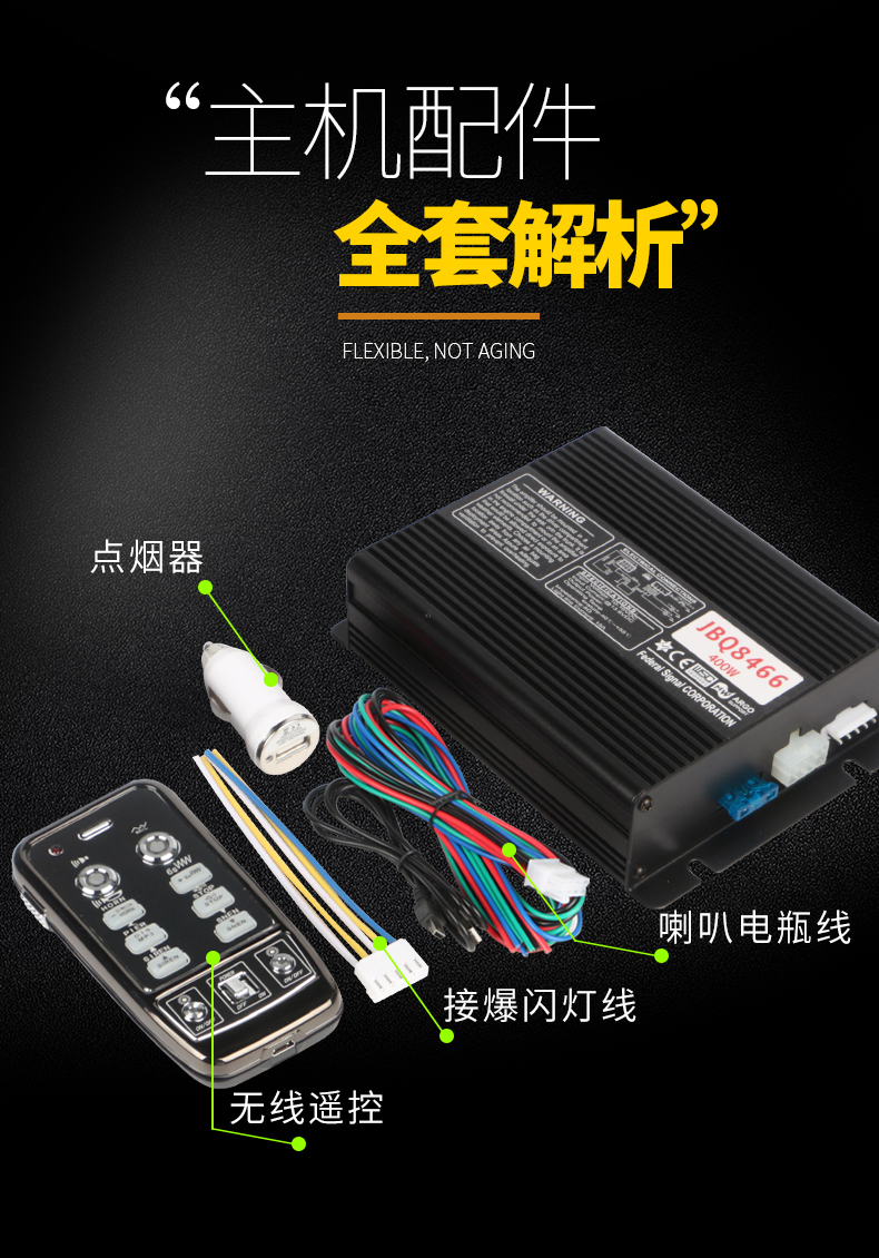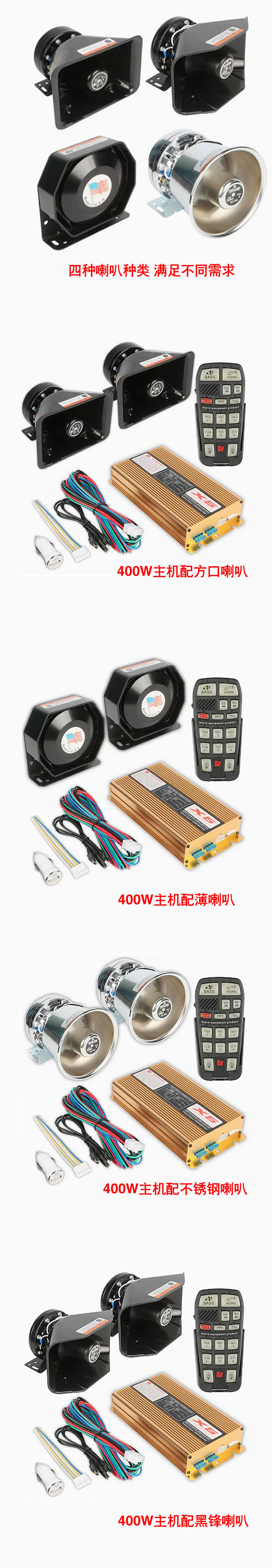 本公司係專(zhuān)業警(jǐng)用裝備企業,常年為(wéi)國家公檢法司單位提供(gòng)車輛改裝和升(shēng)級服(fú)務(wù)。新型(xíng)警車(chē)警笛適合O牌警車(chē),武警車,開道警車等增加和增配使用,產品性能相當可靠,已通過十年客戶(hù)使用實際案例反饋,產(chǎn)品品控0故障率。產品提供終身售後和(hé)質保。 產品(pǐn)主機和喇叭采用分體式結構,布局簡單靈活(huó),方便操作,主機采用微型單片機芯片控製電路,性能穩定,壽命長, 無線遙控主機,內置燈控,麥克風,傳輸(shū)和控製一體(tǐ)化(huà),單雙聲道切換,雙聲道延時混響(此功能給人以很多警音(yīn)混響,聲勢浩(hào)大) 技術參數: 電(diàn)壓: 12V直流 可選24V 輸出功率: 400W-600W-800W-1200W-1600W 輸出阻抗: 8歐姆X 2 聲音失真度: <5% 燈控電流: 10A X 2 工作環境: -40℃- +50℃ 主要功能特(tè)點: 全無線遙控操作:無線(xiàn)喊話、無線遙控控製各種聲音(yīn)及燈。聲音種類(lèi)多(duō)達9種。 關機(jī)記憶:關機後,可保留上次選定的狀(zhuàng)態,下次開 機(jī)使用時,重現上次選定狀態。 燈控製:可控製兩路燈。 充電(diàn)操作:手柄內部備有可充(chōng)電池,無(wú)電時,可插在點 煙器插座上充電。 功耗(hào)低:手(shǒu)柄每充電一次,可連續通話可達15小(xiǎo)時。 配接簡單:發射模組已為成品,充電即可使用(yòng);接收 模組有一個八芯插接線,可與任何 型號警報器主機方便配套。 遙(yáo)控頻率采用(yòng)開放頻頻段300MHZ--450MHZ,無需申請(qǐng)。 使用(yòng)方便(biàn),操作簡單:解脫了線的束縛,可遠離駕駛室,自由自在的操作;操作方法(fǎ),一分鍾(zhōng)即會。