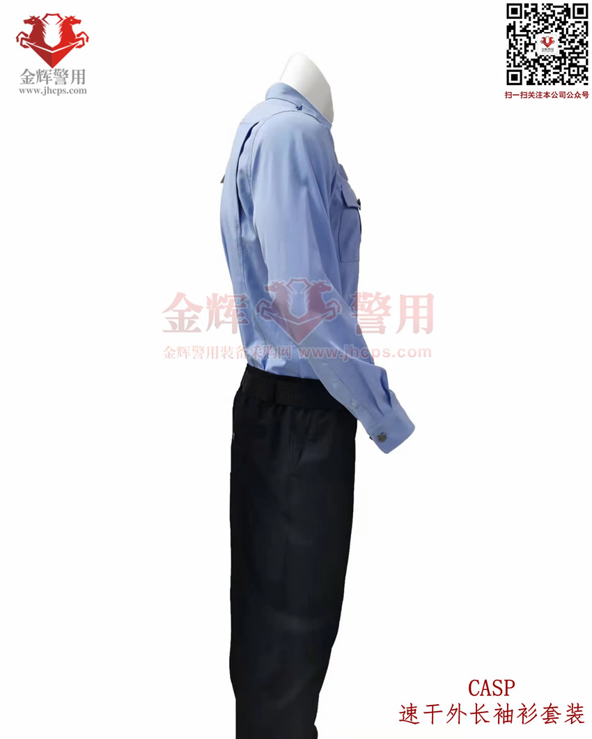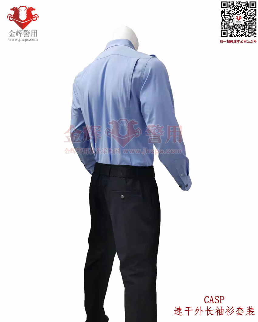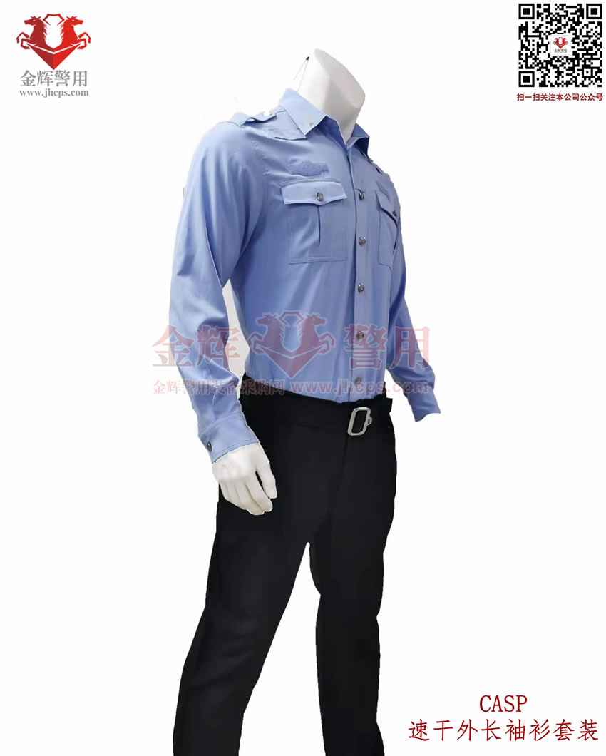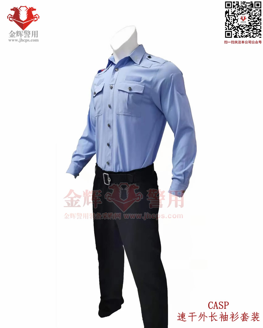 新式警服外長袖衫,港版修身警用執勤(qín)襯衣套裝,CASP港版新式外長袖衫套裝,港版修身係(xì)列。上衣和褲子材料為彈(dàn)力透氣麵(miàn)料,天藍色上衣(yī),黑色速幹西褲,具備(bèi)修身效果,穿著(zhe)舒(shū)適跨度(dù)完美,具備透氣快(kuài)感,戰術執勤執法穿著均合適。魔術貼臂章設計,完美配合現役配飾,符合製式配置。
