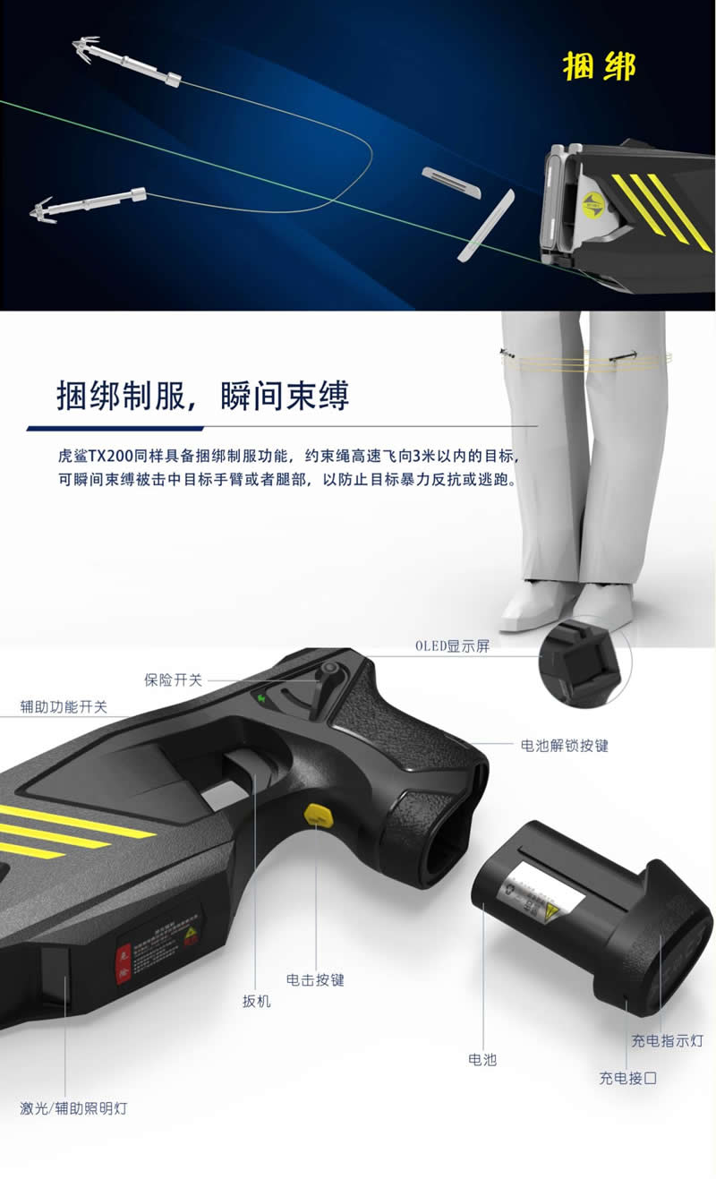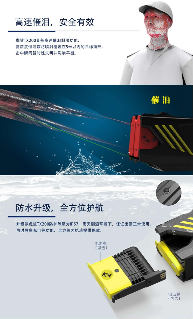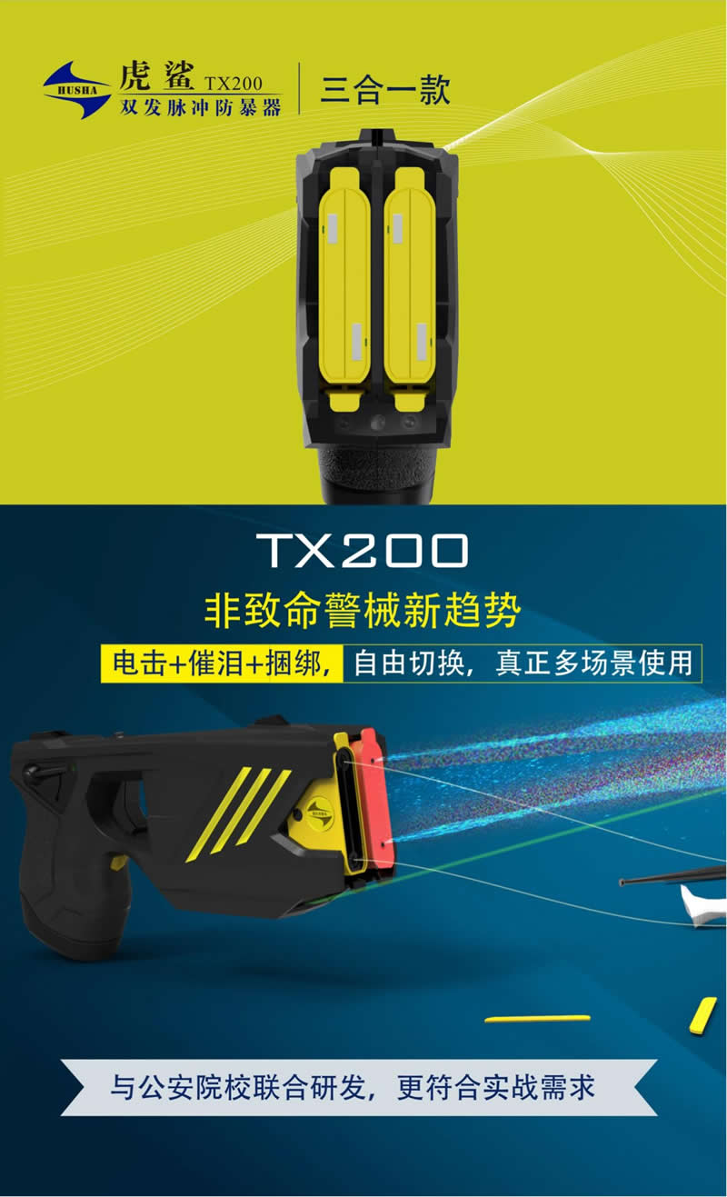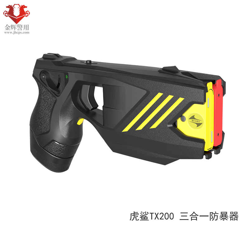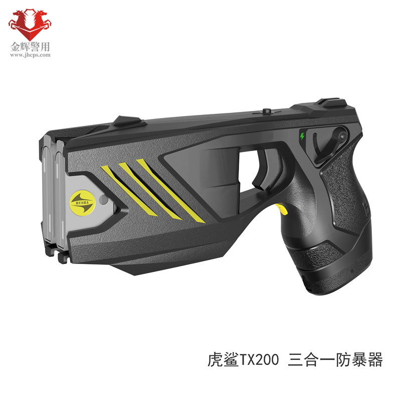 虎鯊(shā)TX200係列三合一多功能警用電擊防暴器,集合電擊、催淚、捆綁為(wéi)一體,安全可靠,高效處突。