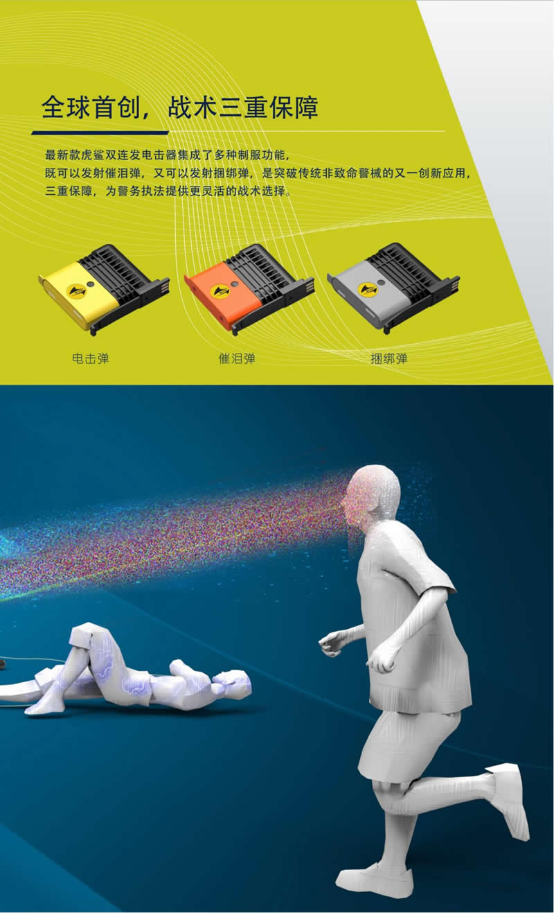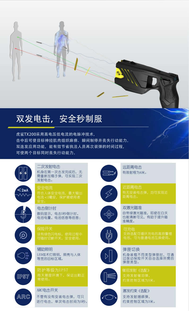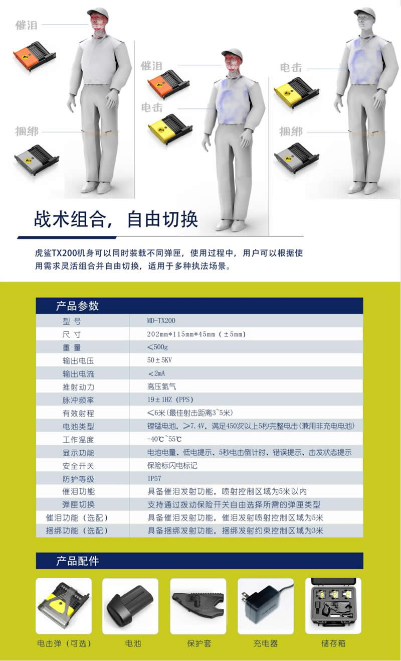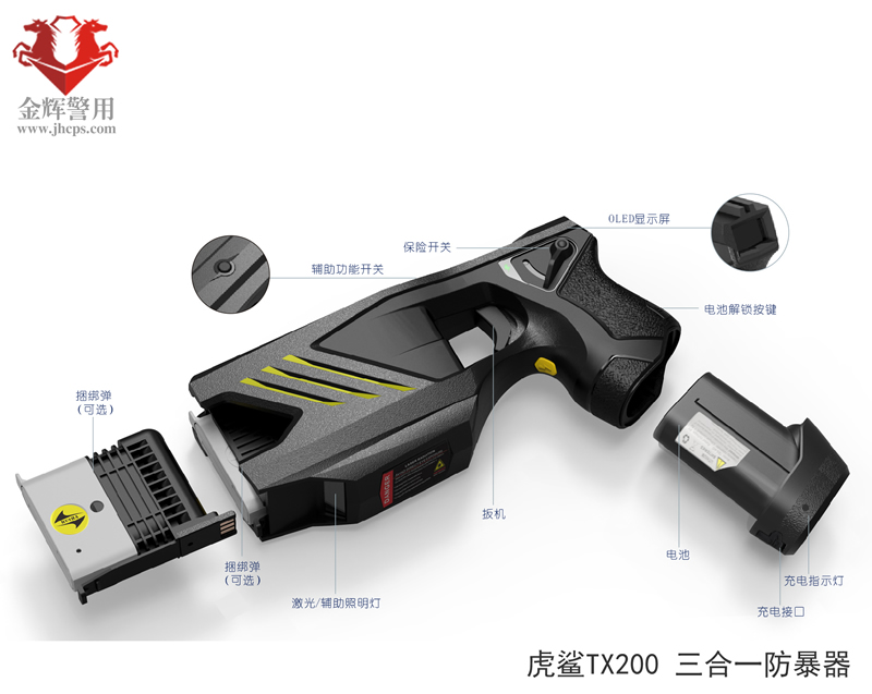虎鯊(shā)TX200係列三合一多功能警用電擊防暴器,集合電擊、催淚、捆綁為(wéi)一體,安全可靠,高效處突。