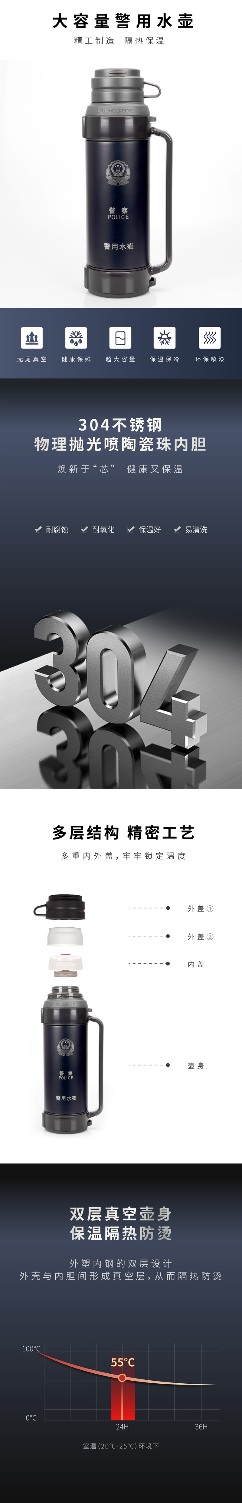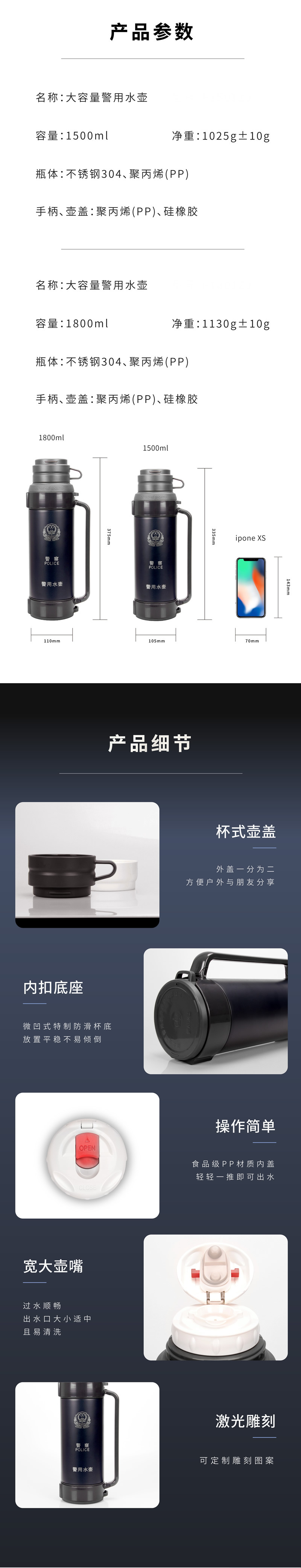 警用不鏽鋼保溫壺,公安(ān)部入圍(wéi)產品,全國品質口碑最好的的警用保溫水壺企業出品(pǐn)。可選1.5和1.8升容量。