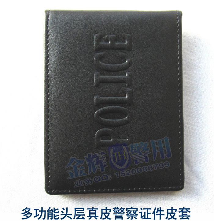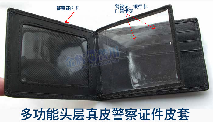 本款證件皮套采用純(chún)頭(tóu)層小牛真皮(pí),結(jié)實耐用(yòng),不脫皮、不開裂,此款證件(jiàn)皮套是2016年最新款式,外鑲銀色金屬警徽,鋼壓警察中英文字。內裏采用透明PVC膜,結合卡片式內裏可以方便攜帶證件和卡片。